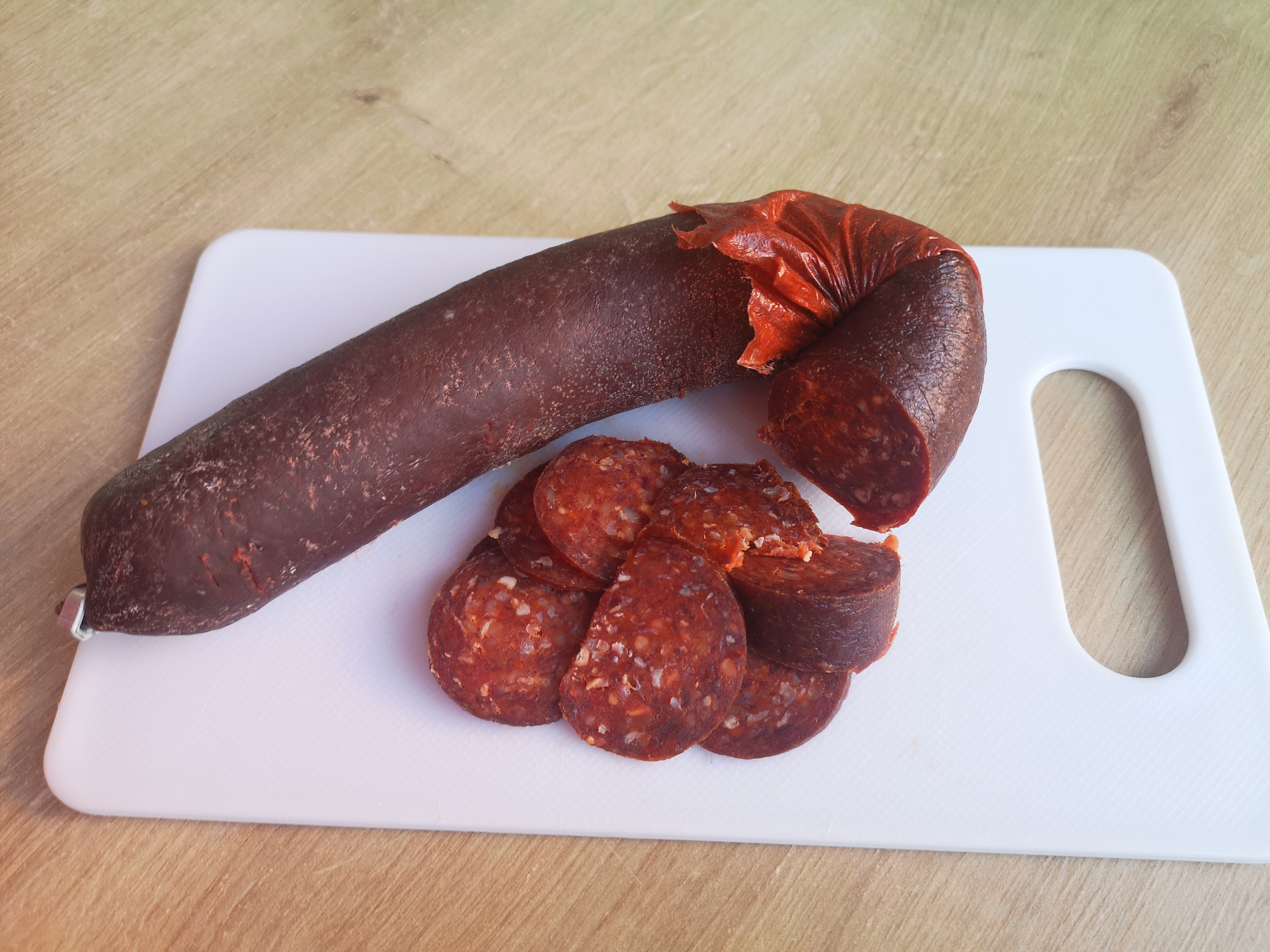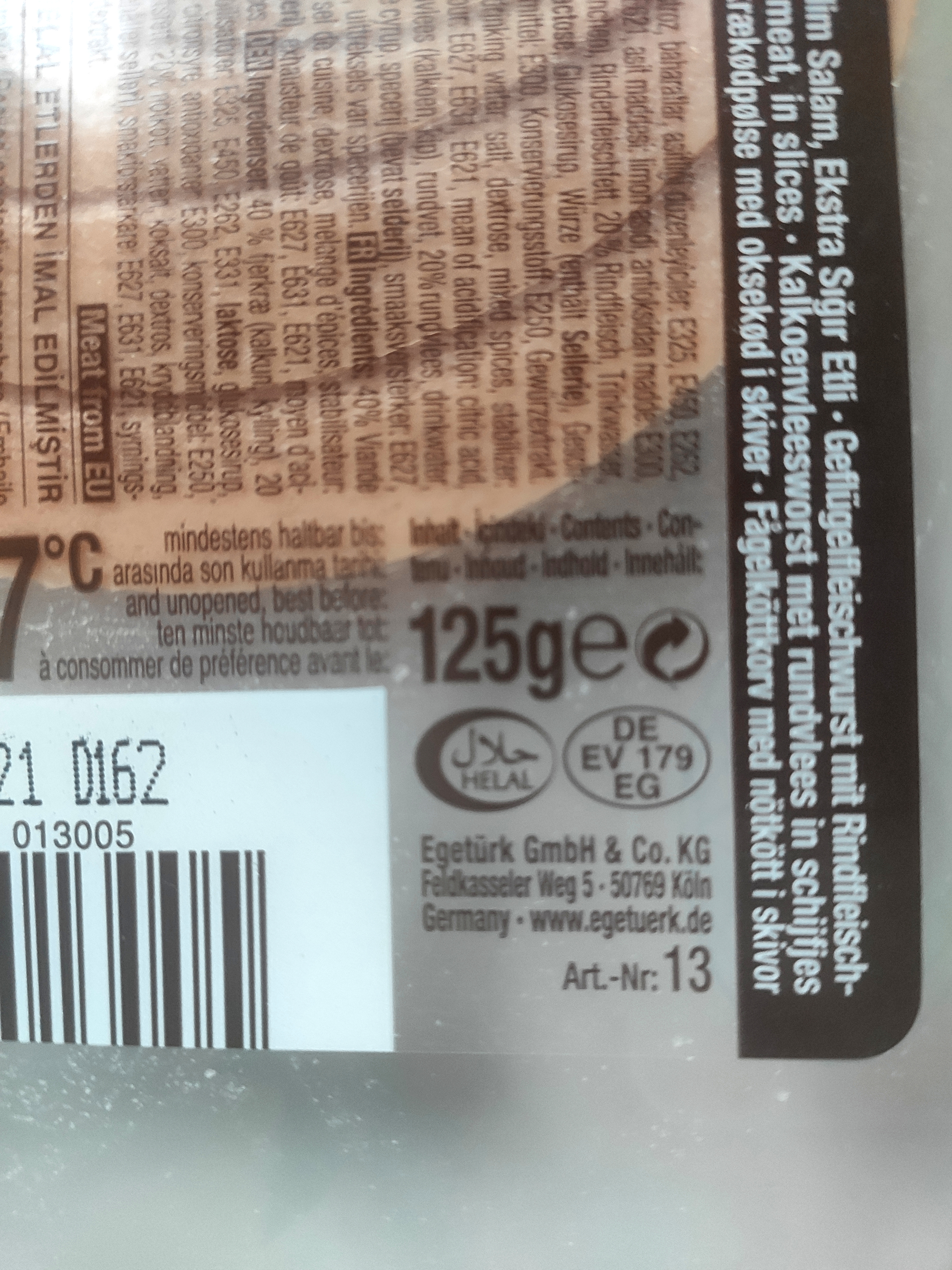 kvalitná saláma z hovädzieho mäsa. Predáva sa v 2 variantoch: nepikantná a pikantná. Je vhodná na priamu konzumáciu alebo aj ako obloha pizze. Zakúpené v Orients heart v Košiciach. Na druhom obrázku narezaná pikantná verzia.